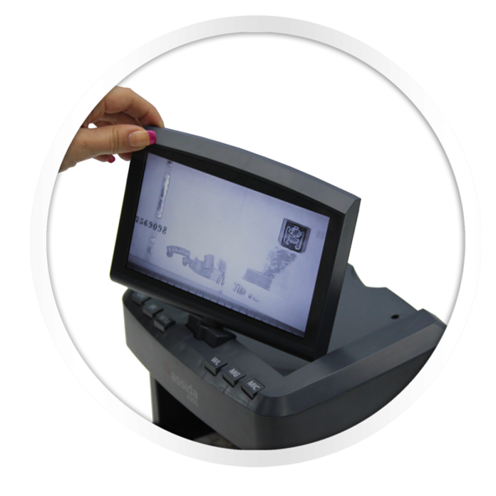 Большой LCD дисплей, регулируемый в двух положениях, позволяет удобно организовать рабочее место кассира. С помощью выносной видеоспектральной лупы с 20-кратным увеличением возможен анализ подлинности в УФ, ИК и белом спектре света на экспертном уровне.
